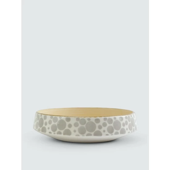 The Earth Shallow Bowl combines mid-century neutral tones with an angled silhouette in a playful handpainted pattern.