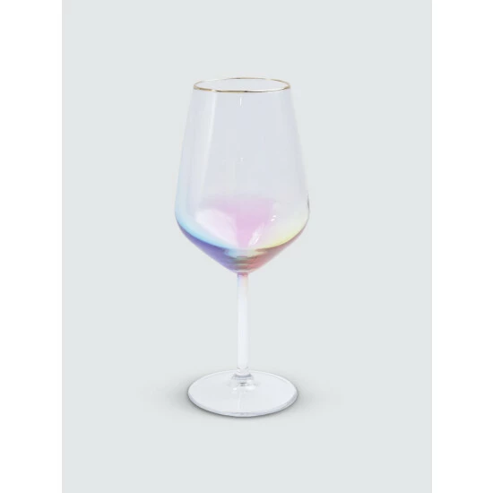 Add sparkle to any setting with a gilded gold rim and varied colored glass that refracts light on the Rainbow Wine Glass.
